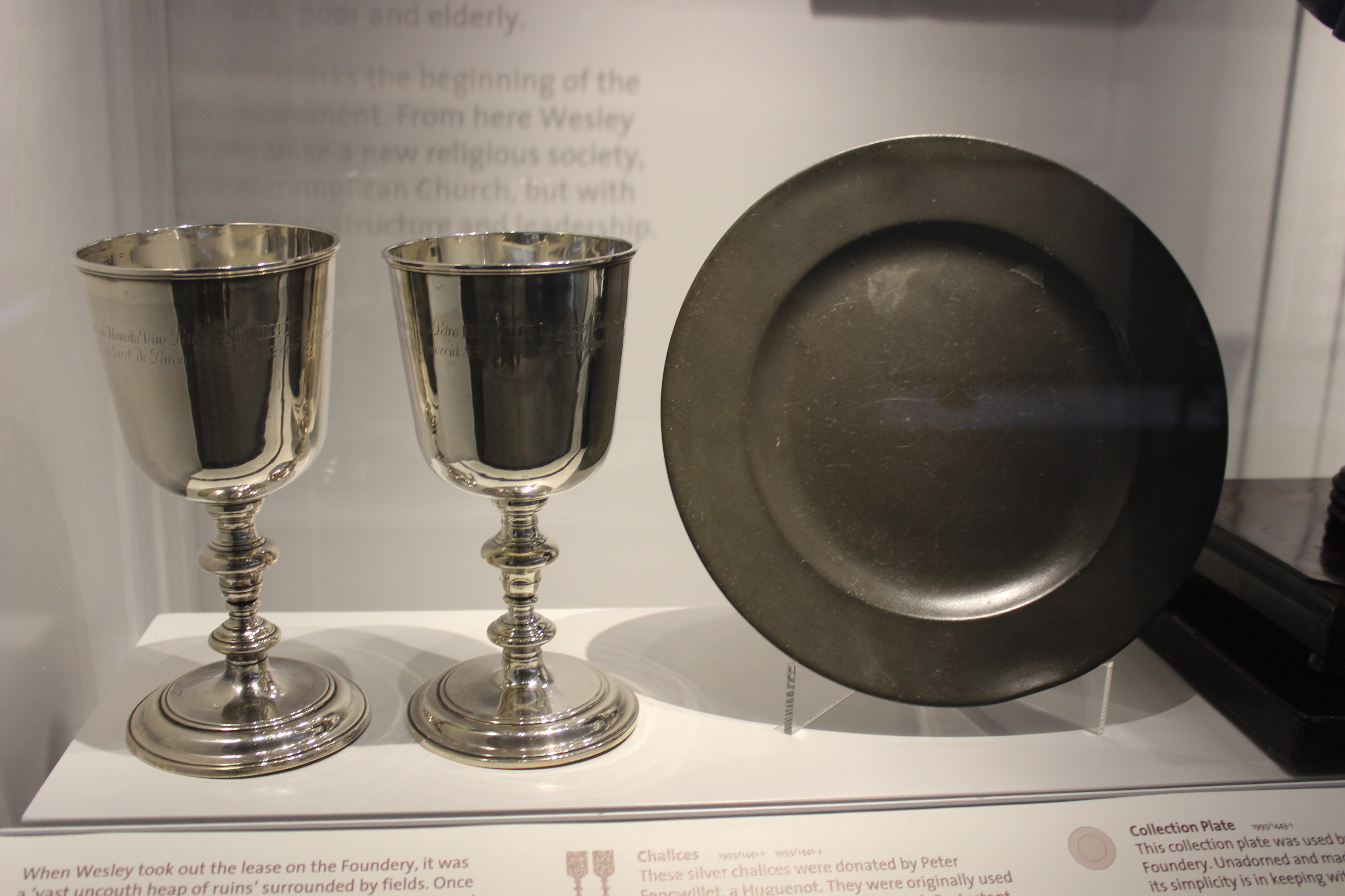 Displayed in the Wesley Chapel museum are the chalices and collection plate used in the Foundery, the first meeting place for Methodists established by John Wesley in London.